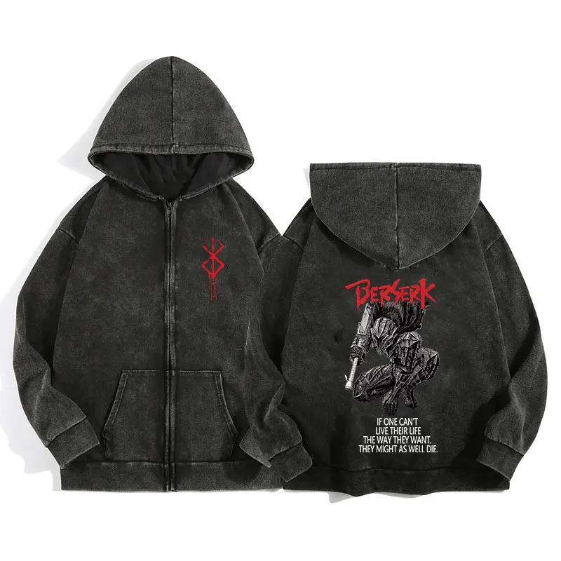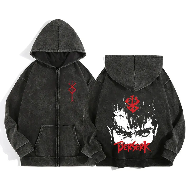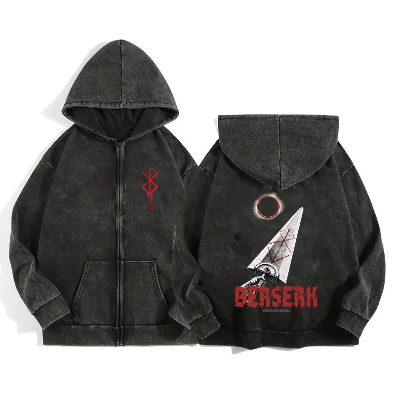 Rock the dark vibes with this Berserk-themed zip-up hoodie, featuring a retro gothic graphic—perfect for Harajuku fashion lovers and hip hop streetwear fans.