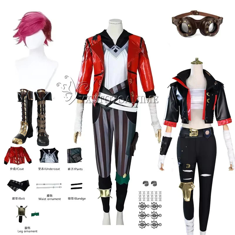 Complete costume includes jacket, pants, gloves, and accessories inspired by Vi’s Arcane look