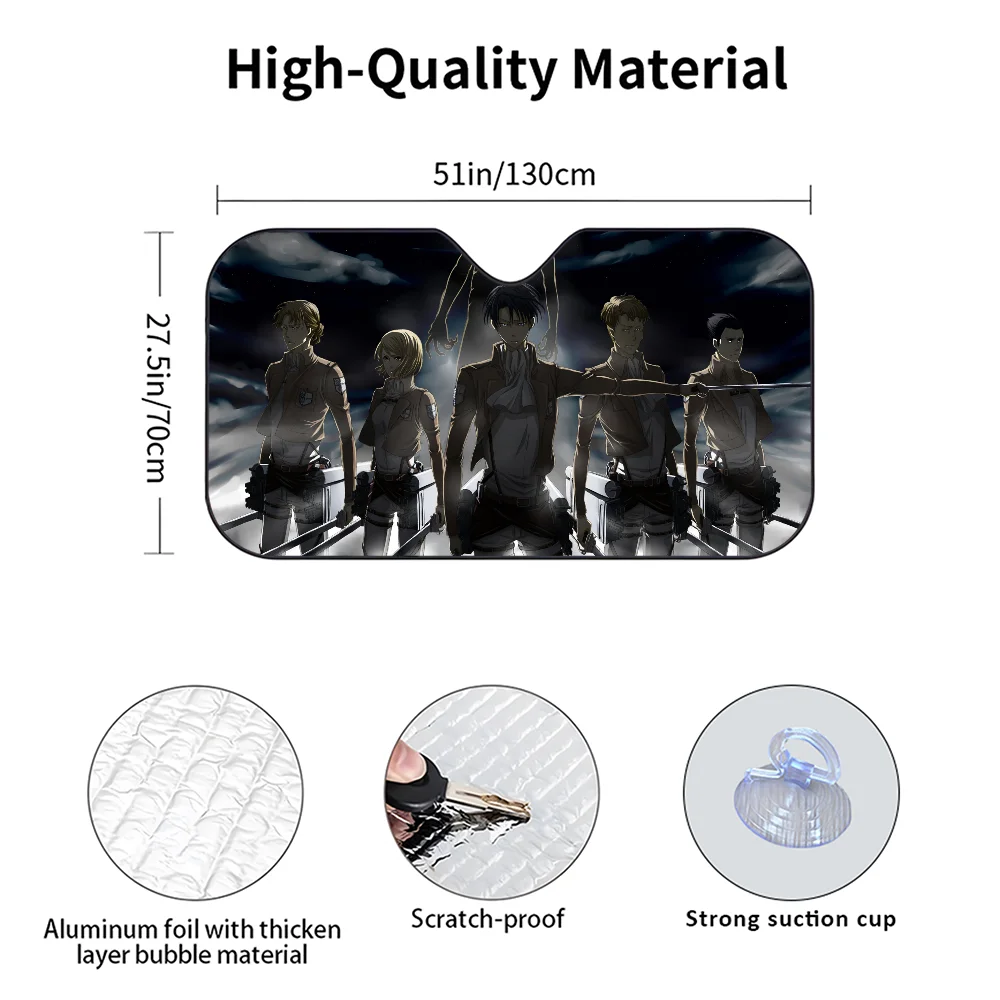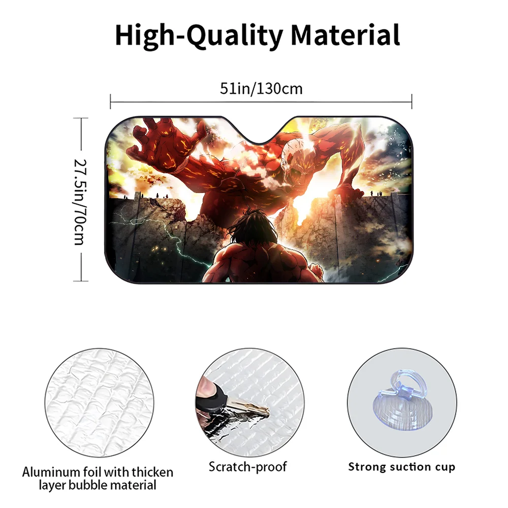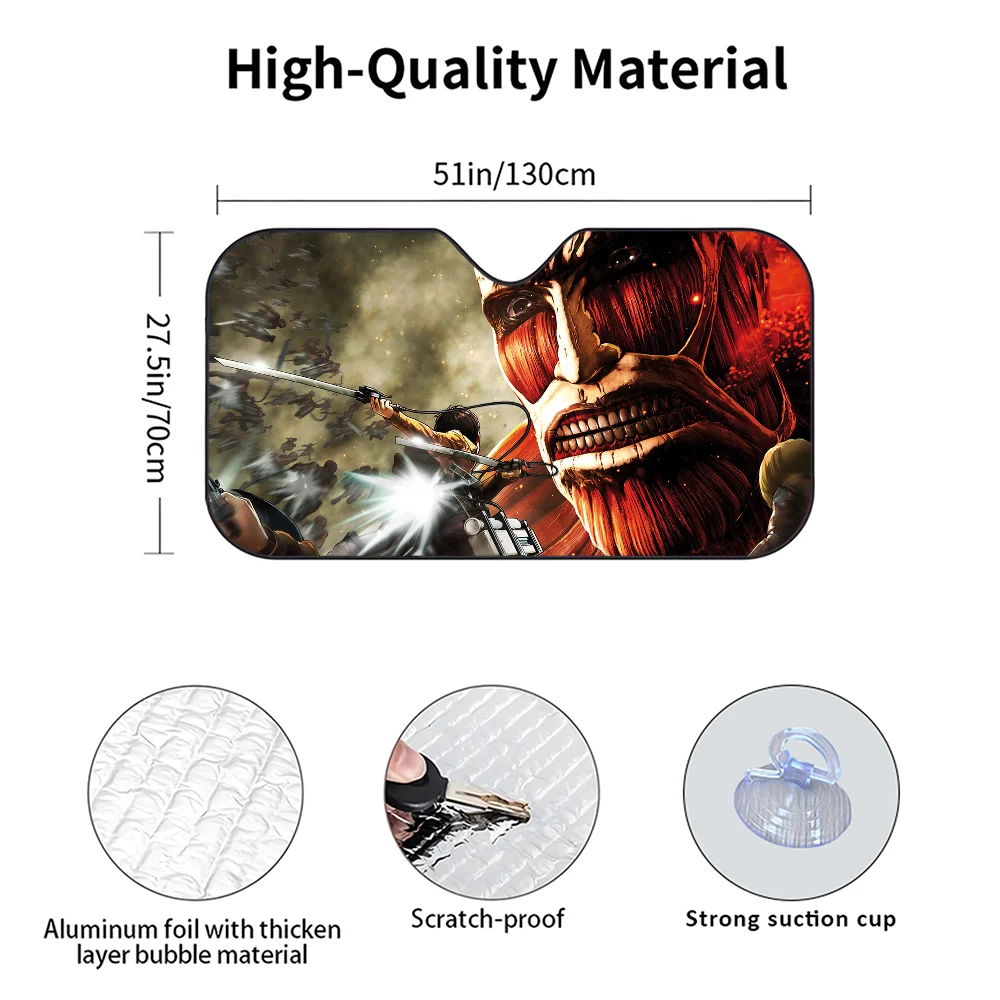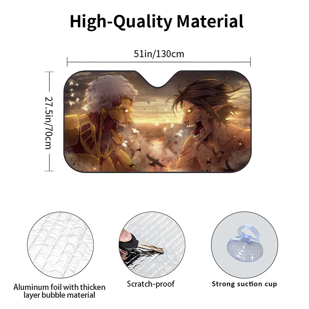 Shield your car from the blazing sun with this Attack on Titan aluminum film sunshade — a reusable and stylish protector that keeps your ride cool while repping your favorite anime.