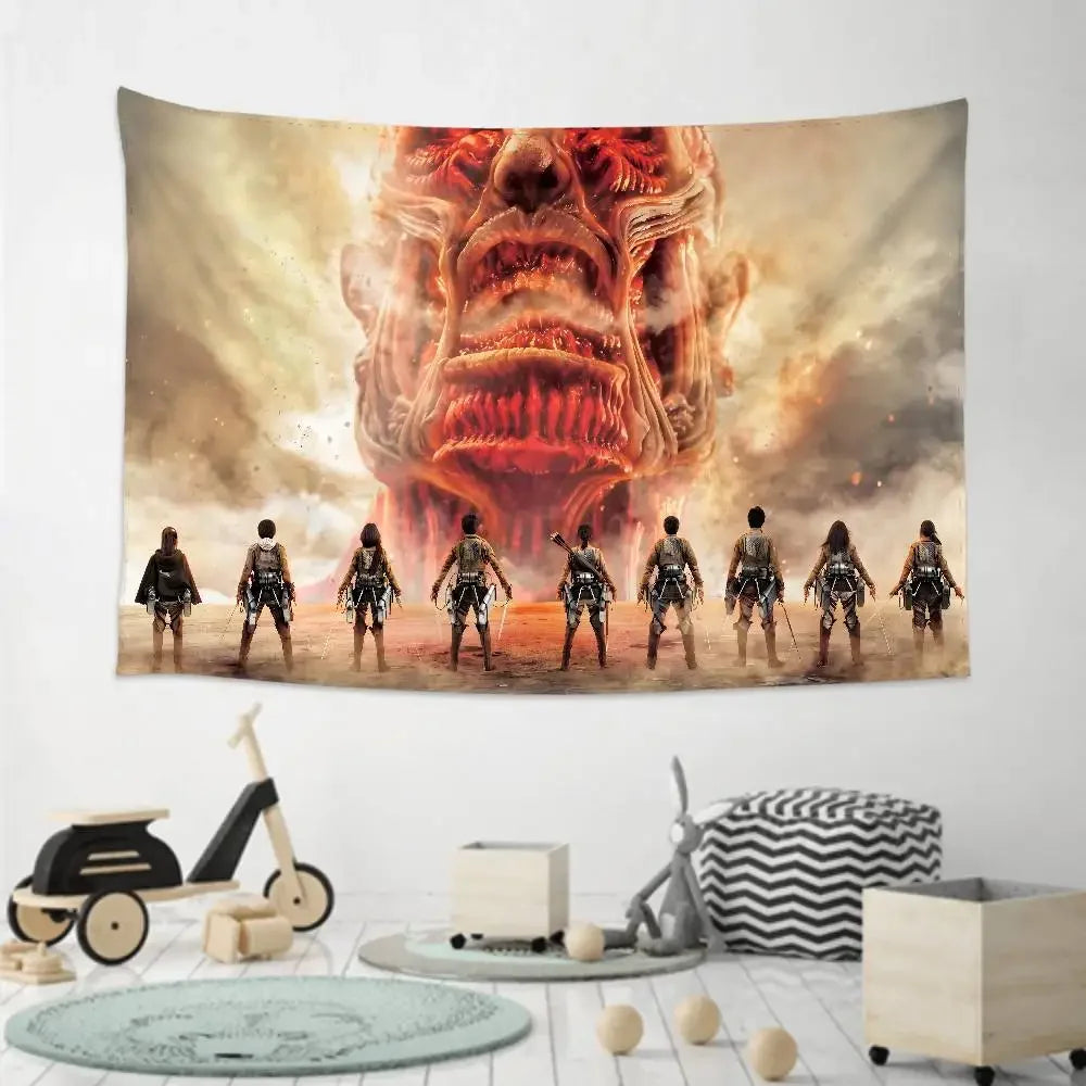 Bring the world of Attack on Titan into your space with this striking tapestry — perfect for bedrooms, party setups, or cozy baby rooms.