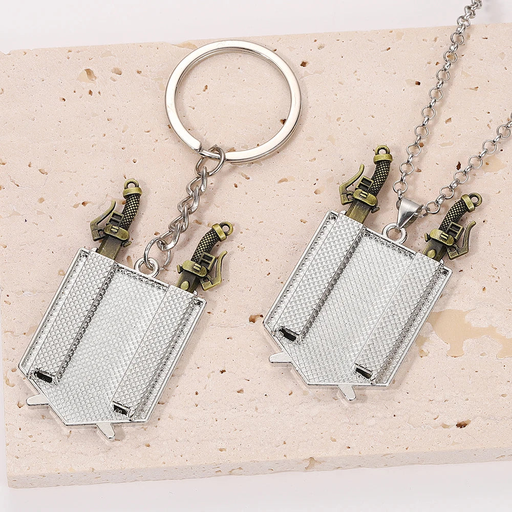 Show your Scout Regiment pride with this stylish Attack on Titan keychain featuring Eren’s double blades and the iconic Wings of Liberty emblem.