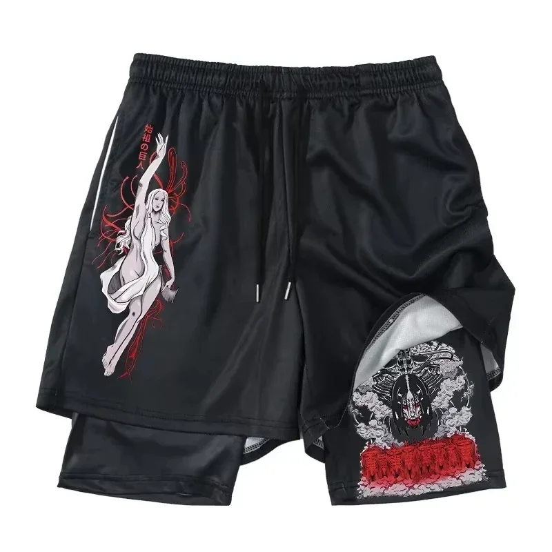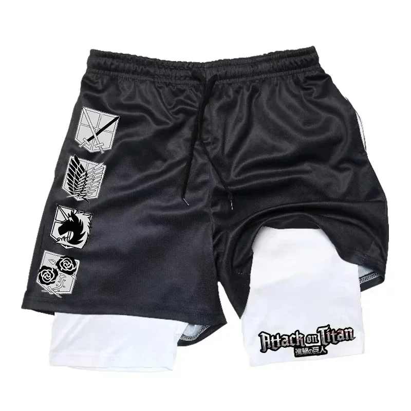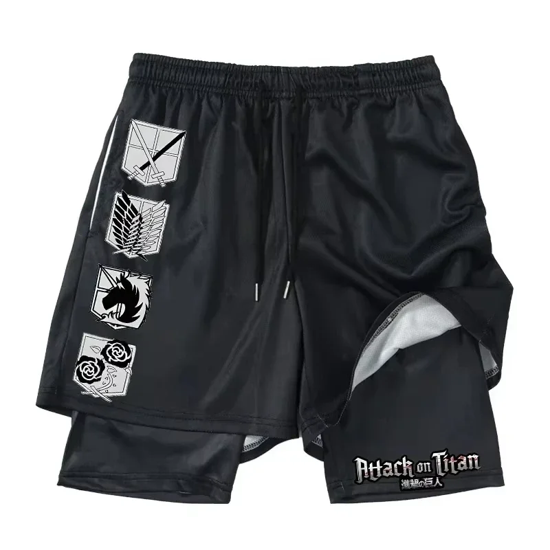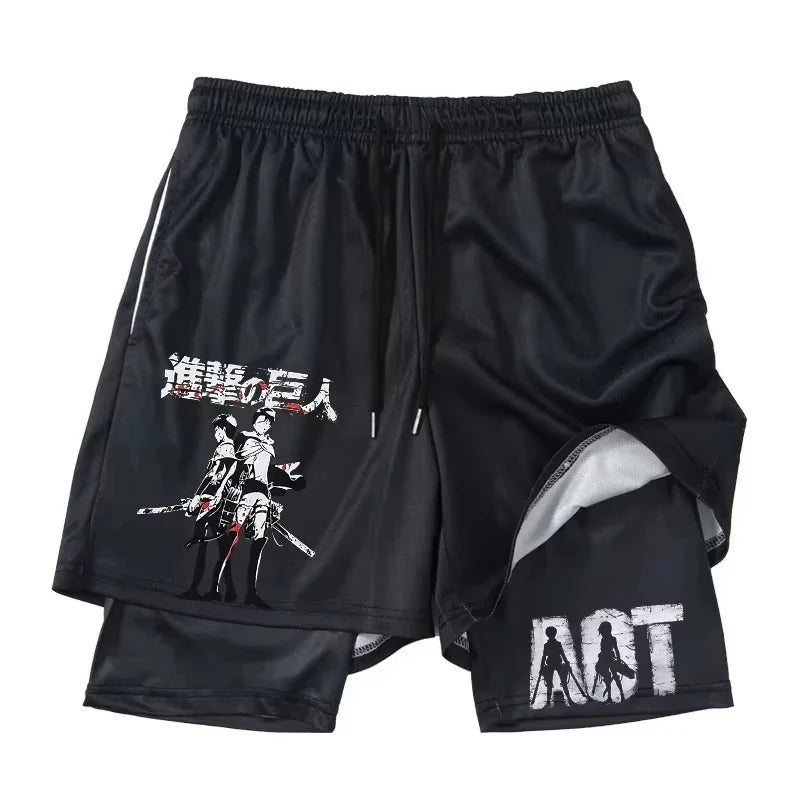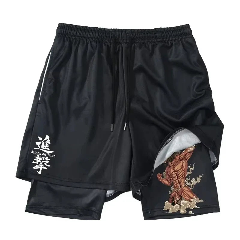 Stay active and stylish this summer with these Attack on Titan printed 2-in-1 gym shorts, featuring compression inner shorts and quick-drying outer shorts with a convenient pocket.