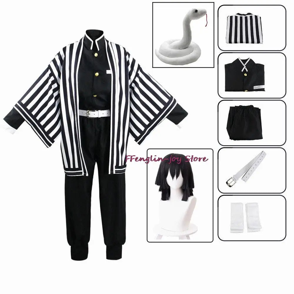 Transform into Iguro Obanai with this authentic kimono cosplay set, complete with a styled wig and signature white snake prop—perfect for Halloween parties and anime cosplay events.