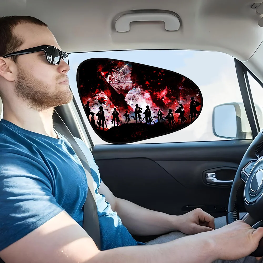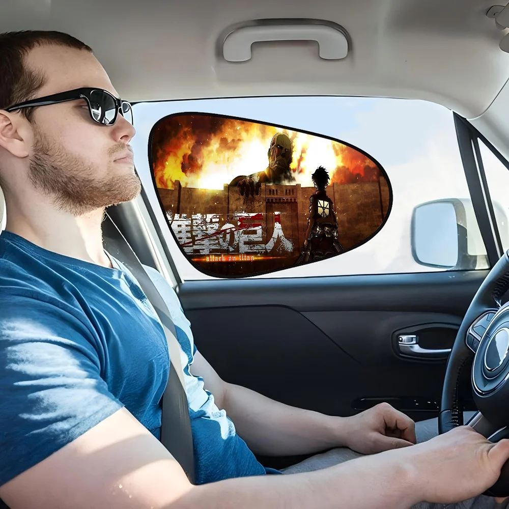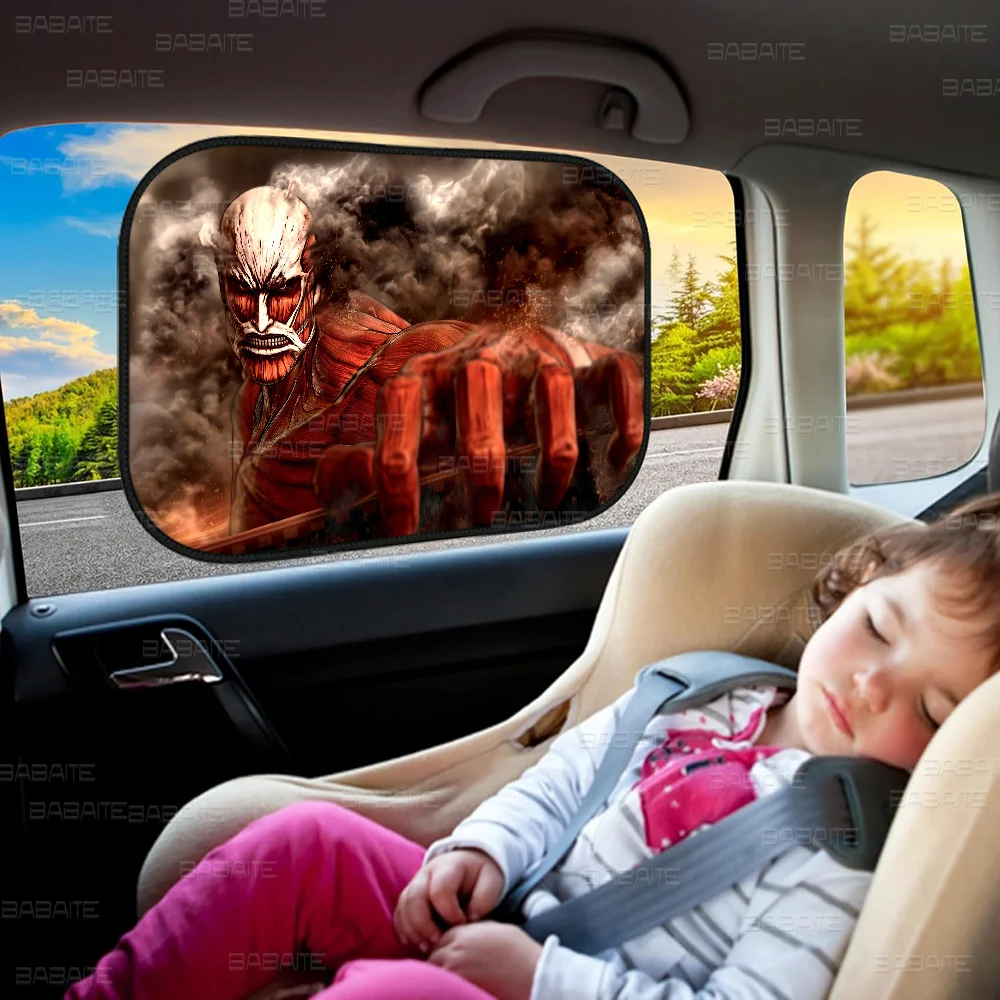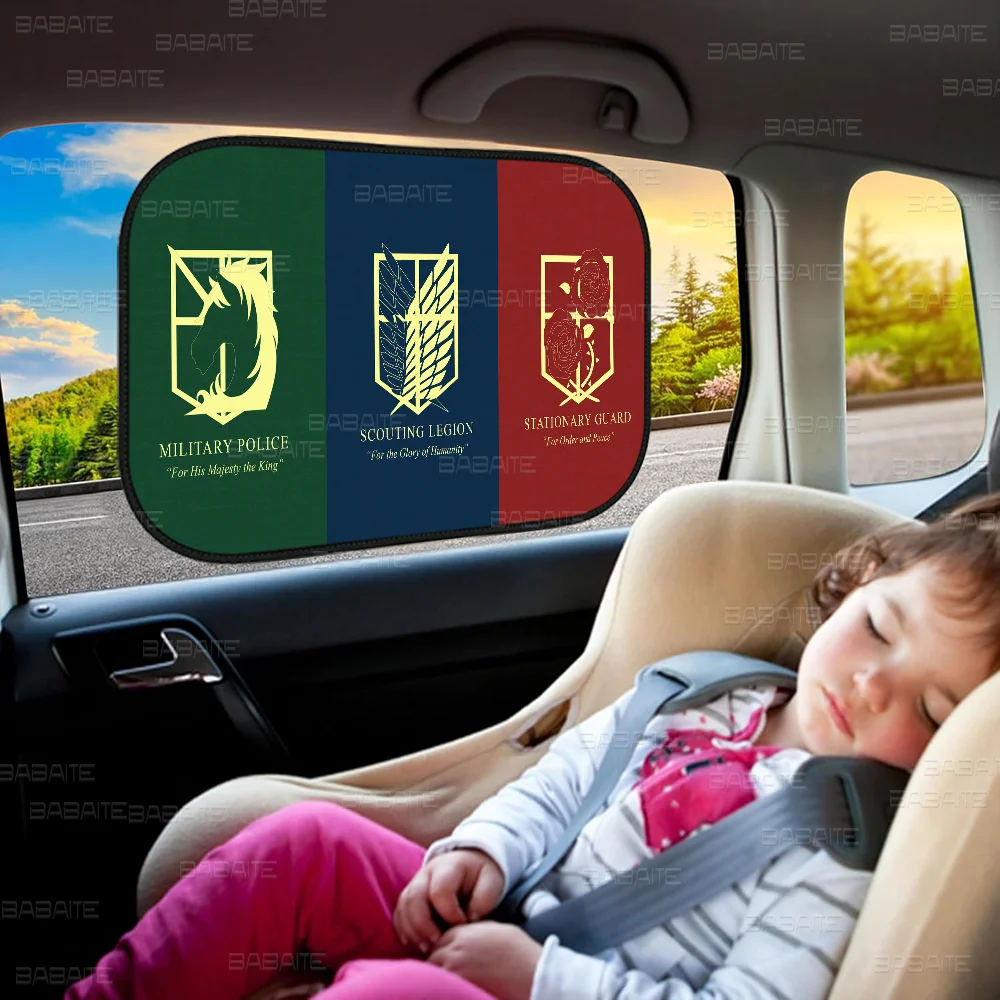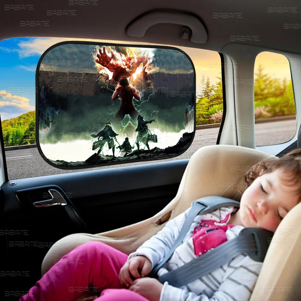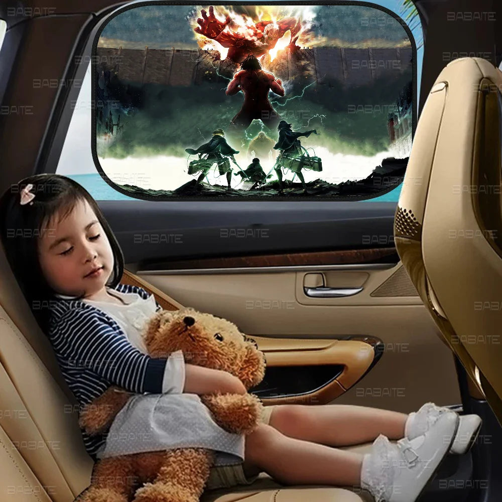 Protect your little ones with this Attack on Titan themed sun shade cover for car side windows — offering 99.9% UV protection and stylish anime design.