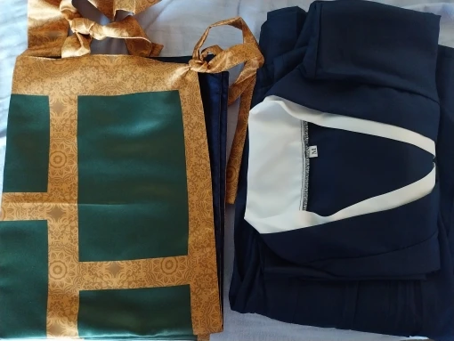 Complete cosplay set with kimono, top, skirt, pants, cassock, wig, and rose net accessory