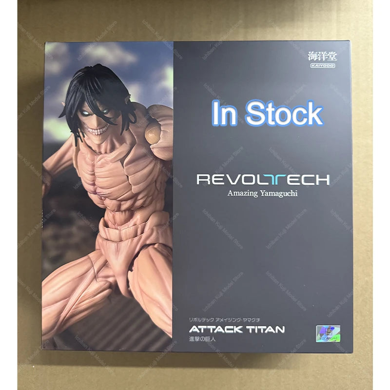 Experience dynamic action poses with the original Kaiyodo Revoltech Amazing Yamaguchi Attack on Titan figures featuring Female Titan Annie Leonhart, Eren Jaeger, and the Armored Titan.